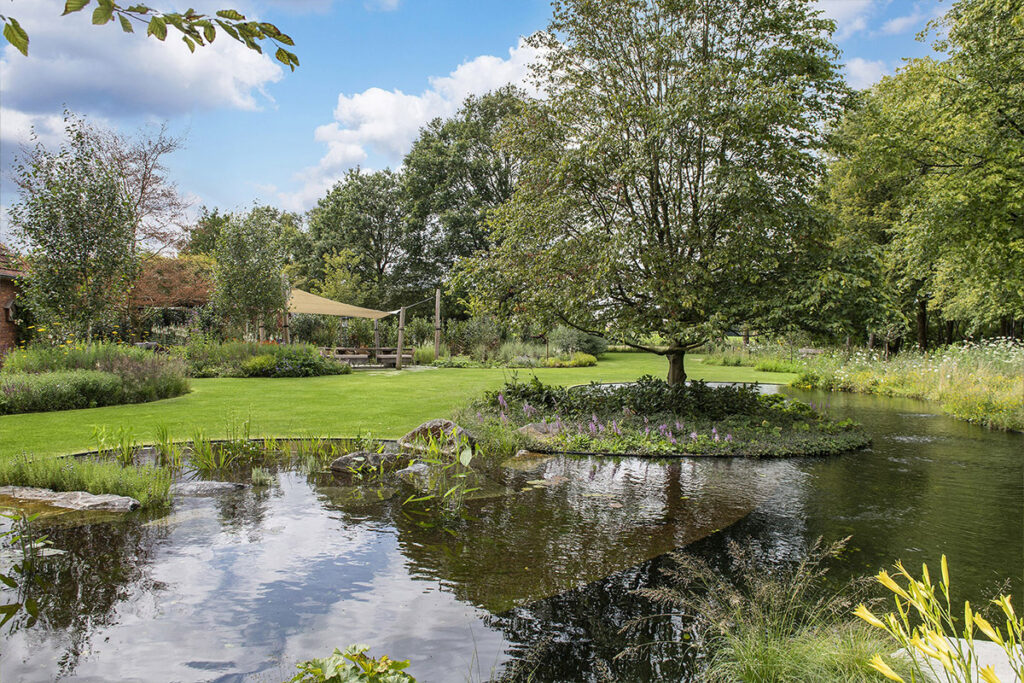 De vijver beschikt over twee filterzones: een ruime helofytenfilter die instaat voor de biologische waterzuivering en een tweede, kleinere zone met irissen en andere oeverplanten die de natuurlijke overgang naar het landschap versterken.