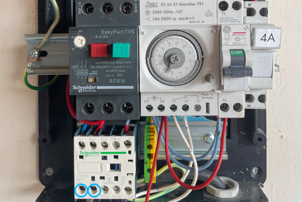 In het geval van pomp 2 moet de bestaande motorbeveiligingsschakelaar vervangen worden door een exemplaar met een hogere capaciteit, bijvoorbeeld een model van 16 ampère, zodat de pomp veilig en zonder onderbrekingen kan functioneren.
