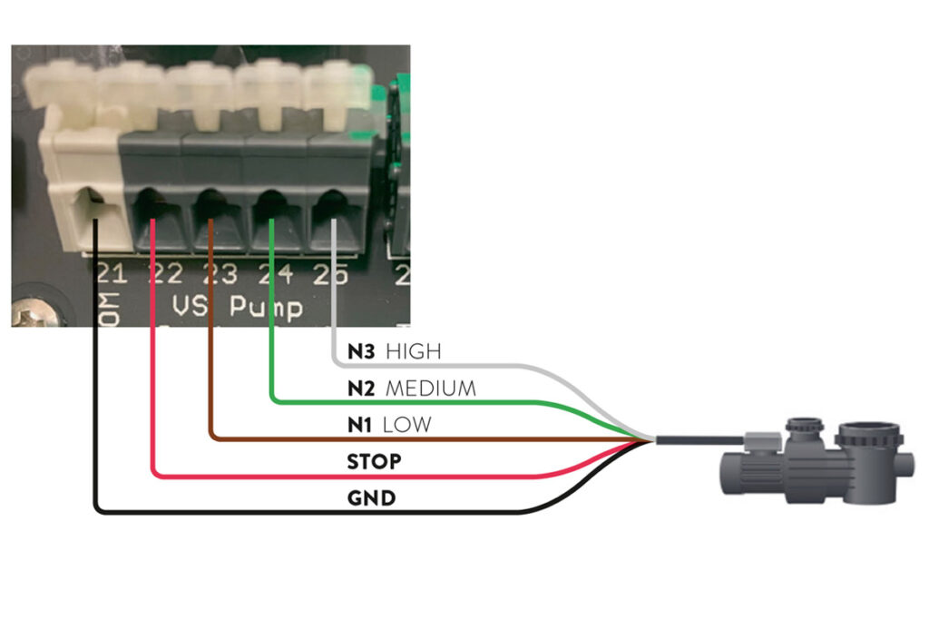 Een bedieningspaneel kan de pompsnelheden en tijdschema’s op twee manieren aansturen, afhankelijk van het type pomp. Dit gaat oftewel via 2 stuurdraden (bus-communicatie), oftewel via een 2 pinsconnector (digitale ingangen/DI’s).
